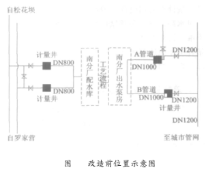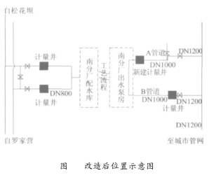 根據(jù)上述分析及現(xiàn)場勘測發(fā)現(xiàn):昆明市*五自來水廠出水A管道時差式超聲波流量計安裝位置下游長度不滿足要求,在探頭安裝位置下游附近管道管徑由1.0m變?yōu)?.2m,并且接有一根DN200的支管。因此在供水高峰期時,此段由于三通、閥門影響,水流易產(chǎn)生紊流、渦流從而產(chǎn)生氣泡,大大減小聲波信號的強(qiáng)度,致使時差式超聲波流量計出現(xiàn)信號中斷。通過在探頭位置靠近出水泵房一側(cè)移動7m挖計量井,其位置滿足上下游直管段長度要求,利用便攜式超聲波流量計在此位置進(jìn)行水流計量檢驗,其結(jié)果信號良好。由此說明先前探頭安裝直管段長度不滿足要求造成信號中斷。時差式超聲波流量計位置見圖4。